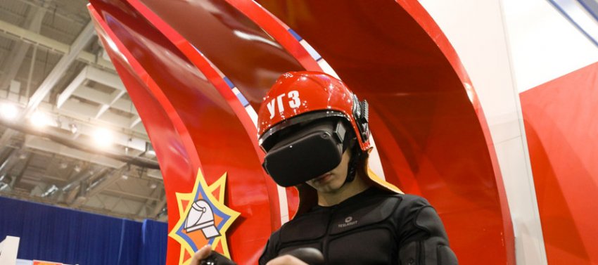 Университет гражданской защиты МЧС представил экспериментальный макет тренажера, предназначенного для подготовки огнеборцев. Комплекс, состоящий из костюма, виртуального шлема и компьютера, позволяет моделировать любые чрезвычайные ситуации, которые сложно воссоздать во время учебы. Виртуальная реальность моделирует экстремальные ситуации, а за счет использования костюма и обратной тактильной связи обучающийся может ощущать не только прикосновения, но и охлаждение, высокую температуру, поражение током. На куртке расположены 36 электродов, чуть меньше — на штанах. Электрическая часть стимулирует нервные окончания и мышечные волокна, сокращая их, и по сути имитирует физические ощущения.