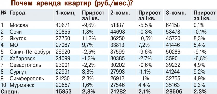 «По итогам первого квартала в Москве сдаваемые в аренду «однушки» стали стоить на 9,6% меньше, чем в начале года, «двушки» — на 5,5%, «трешки» подросли на символические 0,1%, в Санкт-Петербурге динамика оказалась отрицательной по всем трем типам квартир (–2,5%, –9,6% и –9,1%, см. таблицу)», — сообщил гендиректор портала «Мир квартир» Павел Луценко. В топ-10 с самым сильным снижением ставок также вошли Чебоксары (–5,5%, –6,9%, –11,5%), Магнитогорск (–7,5%, –3,1%, –12,4%), Краснодар (–0,5%, –8%, –14,5%), Курган (–0,8%, –5,3%, –10,7%), Улан-Удэ (–5,2%, +5,2%, –13,3%), Хабаровск (–1,3%, –2,7%, –6,8%), Оренбург (+2%, –1,1%, –9,9%) и Набережные Челны (–4%, –8%, –6,4%). Больше всего съемное жилье подорожало в Саранске, где однокомнатные квартиры стали сдаваться на 14,4% дороже, чем три месяца назад, двухкомнатные — на 12%, трехкомнатные — на 13%.