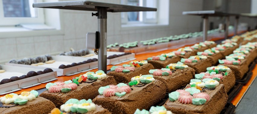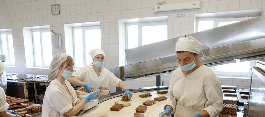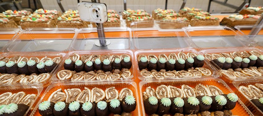 Работа на хлебозаводе кипит: пока в одном месте специалисты работают над тестом и тортами, в другом – красиво декорируют пирожные.