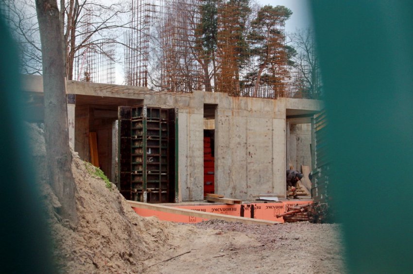 Сейчас на месте дачи Гербель ведется строительство железобетонного каркаса нового здания. Информационного щита на заборе нет. Законность работ оперативно проверить не удалось.