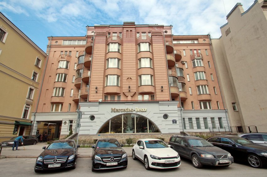 Восьмиэтажный жилой дом был построен в 2001 году по проекту Владимира Попова и Евгения Рапопорта. Застройщиком выступало ОАО «Строительная корпорация „Возрождение Санкт-Петербурга“», входящее в группу «ЛСР». Здание утоплено вглубь квартала, имеет центральный ризалит. Верхняя часть завершалась декоративными аркой и шаром.