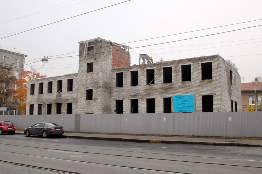 Трехэтажное здание из силикатного кирпича появилось ориентировочно в начале 1990-х годов. Оно строилось как общежитие ленинградского Трамвайно-троллейбусного управления, но работы были брошены. Два десятка лет недострой числился на балансе Горэлектротранса, однако предприятие не стремилось завершить объект. В 2012 году там поясняли «Канонеру», что «вопрос решается».