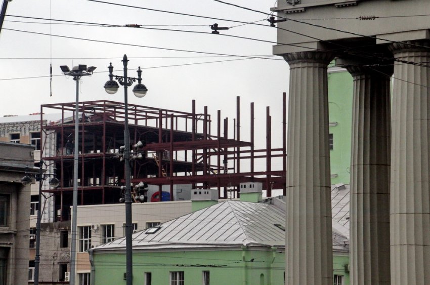 А сейчас ведется надстройка дворовой половины. Над ней соорудили четырехэтажную металлическую конструкцию.