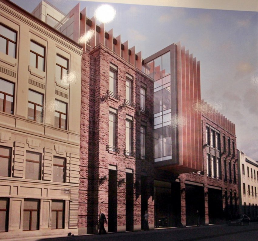 Фасад нового здания отделают клинкерным кирпичом темно-красного цвета. Образ создадут за счет металлических профилей, напоминающих диамагазин; их укрепят на эркере и на верхнем этаже. Офис будет четырехэтажным вдоль улицы, а над дворовой частью сделать пятый этаж с панорамным остеклением.