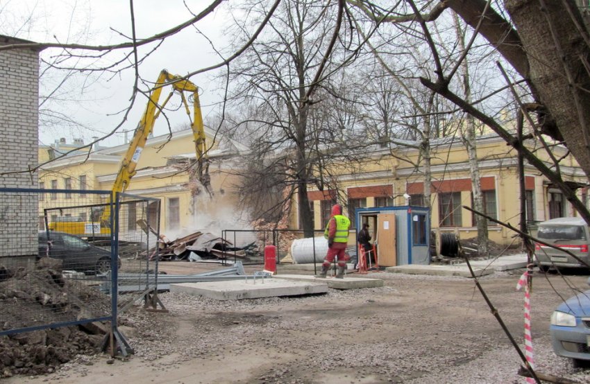 На территории Военно-медицинской академии начали снос двухэтажного здания, стоящего ближе к улице Комиссара Смирнова. Там начинается расчистка территории под многопрофильную клинику.