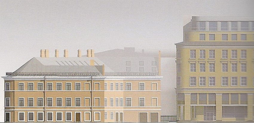 Здание, как и прежде, будет трехэтажным, при этом чердак станет мансардой. На Загородный проспект выйдут семь слуховых окон. На дворовой поверхности кровли запланированы более крупные окна, причем в два ряда. Внутри, как и планировалось, разместится торговля.