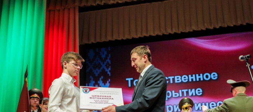 Заместитель председателя Мингорисполкома вручил представителю клуба «Отвага» сертификат на приобретение цифровой фотокамеры.