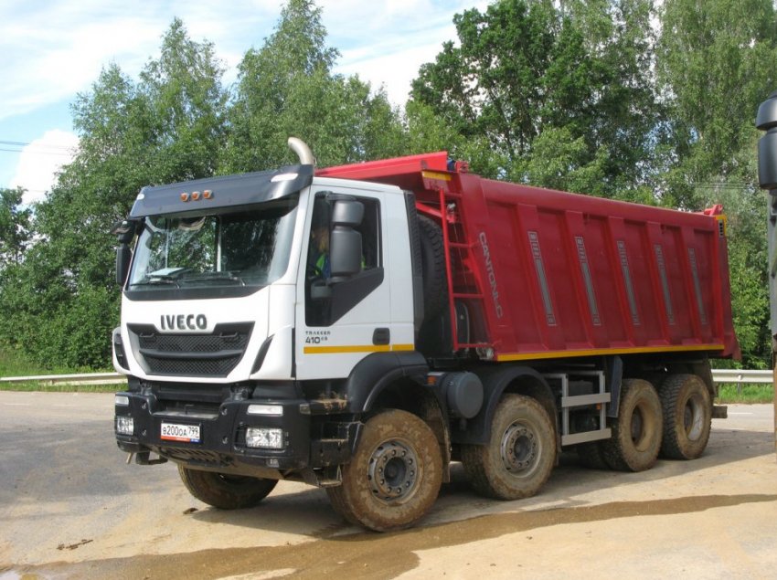IVECO Trakker AD410T41 с колесной формулой 8×4 (допустимая полная масса 41 т), выпущенный на заводе IVECO в Мадриде (Испания), рассчитан на работу и в условиях плохой проходимости, и на дорогах общего пользования. Полезная грузоподъемность до 30 т. Клиентам предлагаются кабины: HI-LAND - т.н. «дневная» (без спального места), и HI-TRACK - со спальным местом. Коробки передач: механическая ZF (16-ступенчатая) или автоматизированная EuroTronic 2 (12 и 16 ступеней). Комплектуется самосвальными кузовами емкостью 20 м3 производства IVECO-AMT, Cantoni (Италия) или Fj (Швеция).