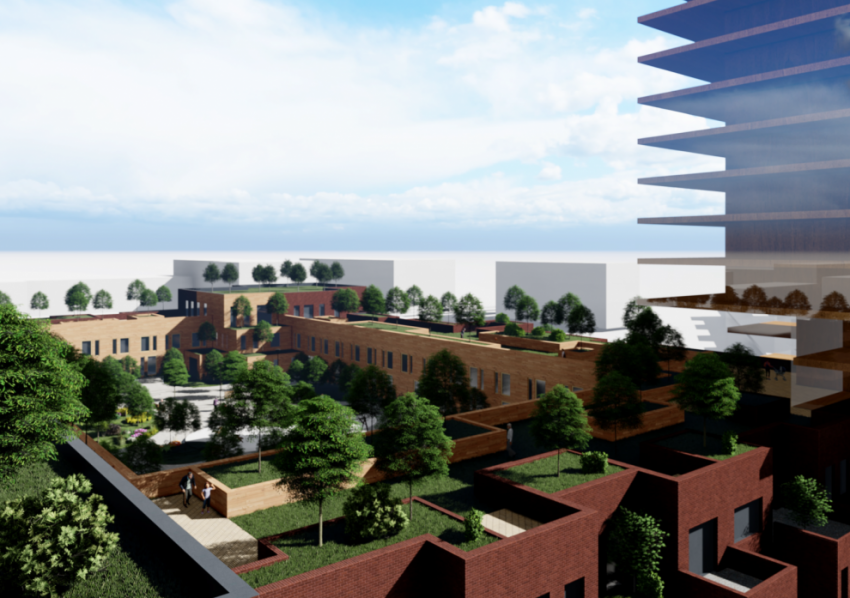 Верх стилобатной части можно превратить в эксплуатируемую крышу, обильно озелененную. Доступ туда будет и с верхних, и с нижних этажей. Точно также будет общедоступным и двор, оснащенный разными активностями для детей и взрослых. Это обеспечивает равный доступ к комфортному общедомовому пространству.