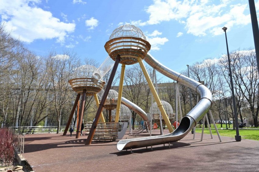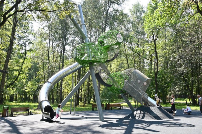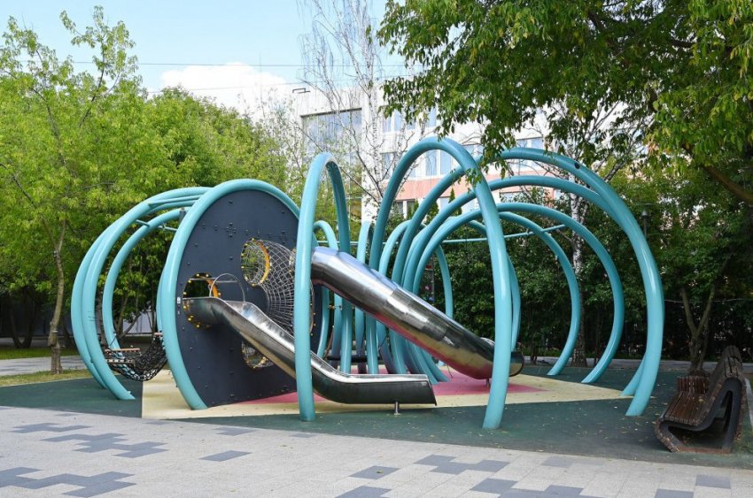 Футуристические “щупальца” игрового комплекса - не только эффектная стилизация, но и отсылка к модному биодизайну. На конструктивной основе крепятся многочисленные гамаки, качели-гнезда, веревочные элементы и даже скалодром. «Зеленая» тема раскрыта и в современном проекте “Оливки” в парке Филатов луг. Игровая площадка стилизована под оливковое дерево, чья высота достигает 10 м.