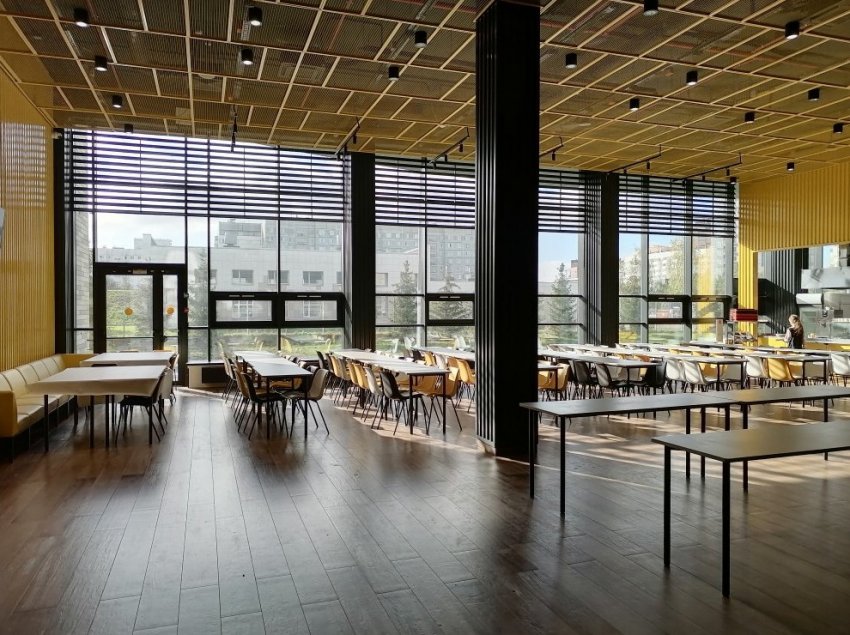 Бюро «МАХА» занималось не только архитектурным проектом, но и дизайном всех школьных интерьеров и даже благоустройством прилегающей территории. Столовая для младших классов здесь – больше похожа на городское кафе, а пищеблок для старшеклассников – на ресторан.