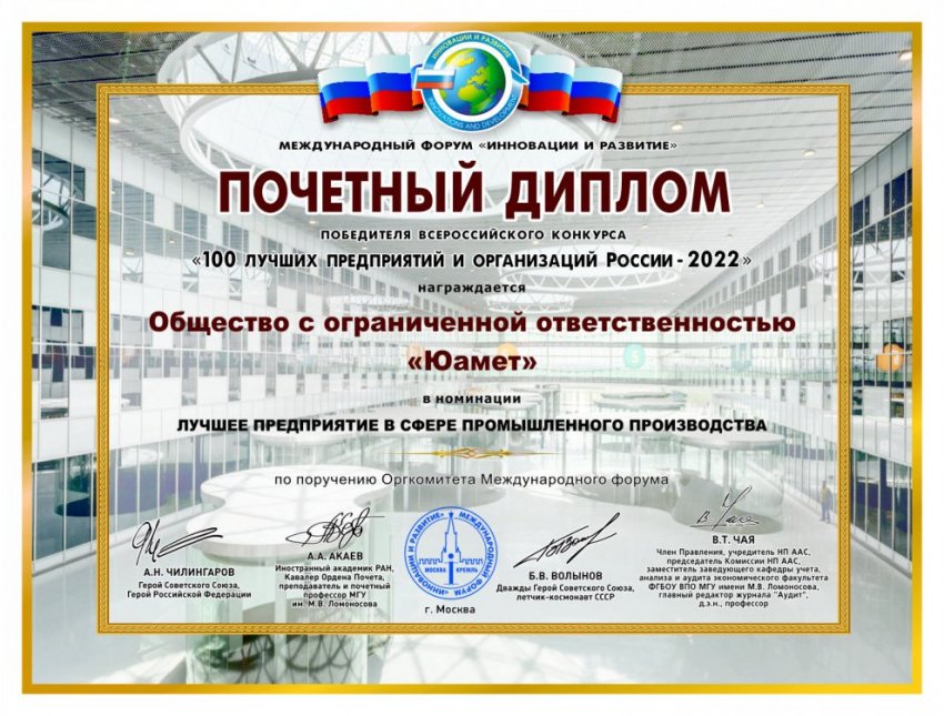 Является победителем всероссийского конкурса «100 лучших предприятий и организаций России - 2022» в номинации «Лучшее предприятие в сфере промышленного производства».
