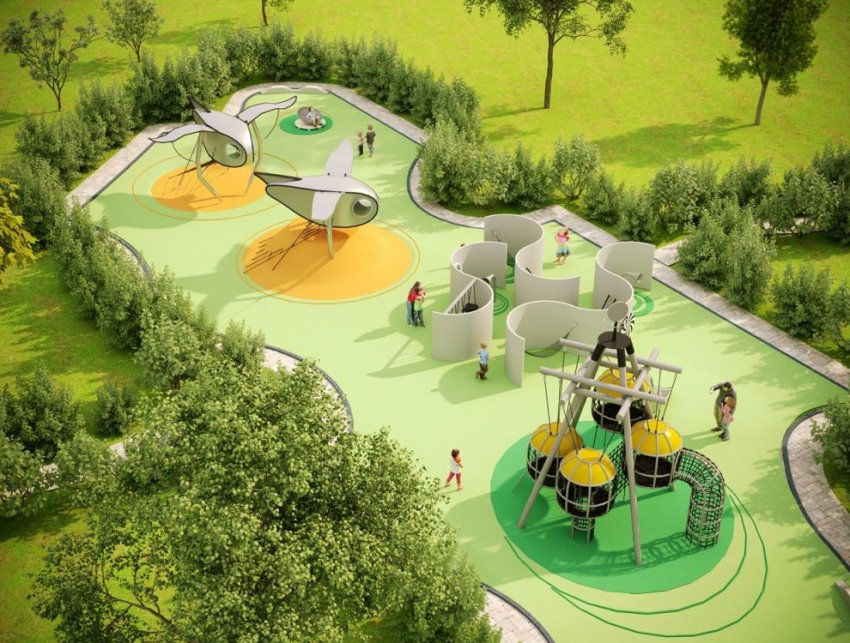 В состав игровой площадки также включен дизайнерский лабиринт, выполненный из архитектурного бетона и идеально подходящий для игр в прятки и догонялки. Он оборудован качалками, гамаками для отдыха и переговорными трубами.