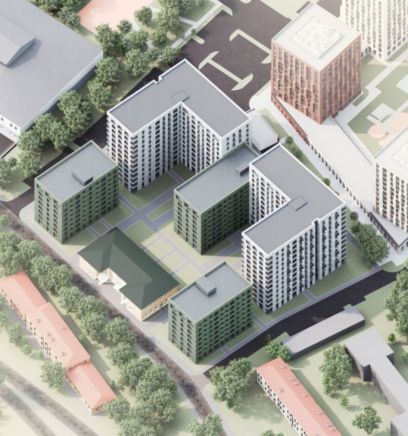 В границы участка, отданного «Пику», попадает институтская «сталинка», сохранившаяся на Шкиперском протоке, 19. Ее решили не трогать, но вокруг обстроить еще одним жилым домом. Он будет с обоих сторон от «сталинки» выходить на проток. Проект разработало ООО «Слои аркитектс» Валентина Когана. Здание собрали из двух Г-образных 12-этажных корпусов белого цвета и трех восьмиэтажных коробок зеленого цвета.