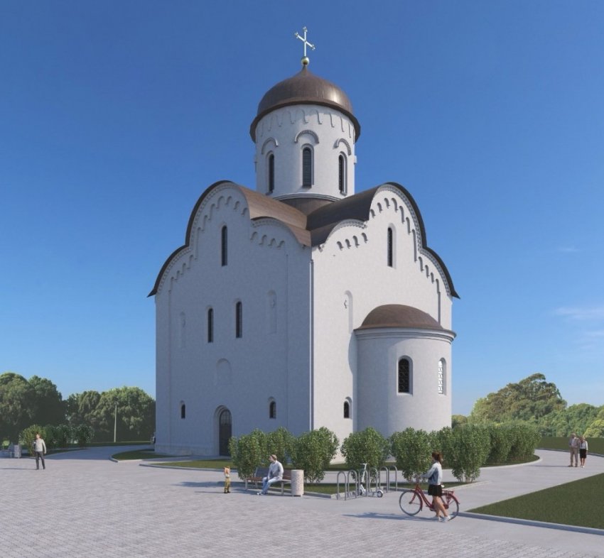 «Храм являет собой образ архитектуры времен святого благоверного князя Александра Невского (XIII век) — времен, когда особо ощущался патриотический подъем... Венчает храм купол, символизирующий собой воинский шлем», — поясняется в брошюре. Судя по картинкам, это будет почти точная копия церкви Николы на Липне под Великим Новгородом, датирующейся 1290-х годами