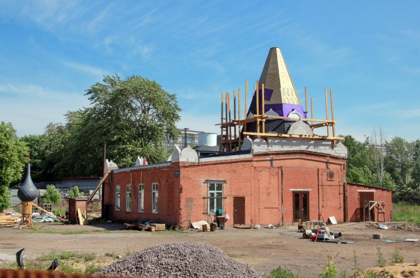 Хозпостройка — единственное здание, оставшееся на участке после расчистки. Прошлым летом «Канонеру» стало известно, что старообрядцы намерены перестроить ее под церковь. По сути, все преобразования сводились к появлению шатра, небольшой маковки, а также шлемовидных украшений из газобетона по периметру крыши.