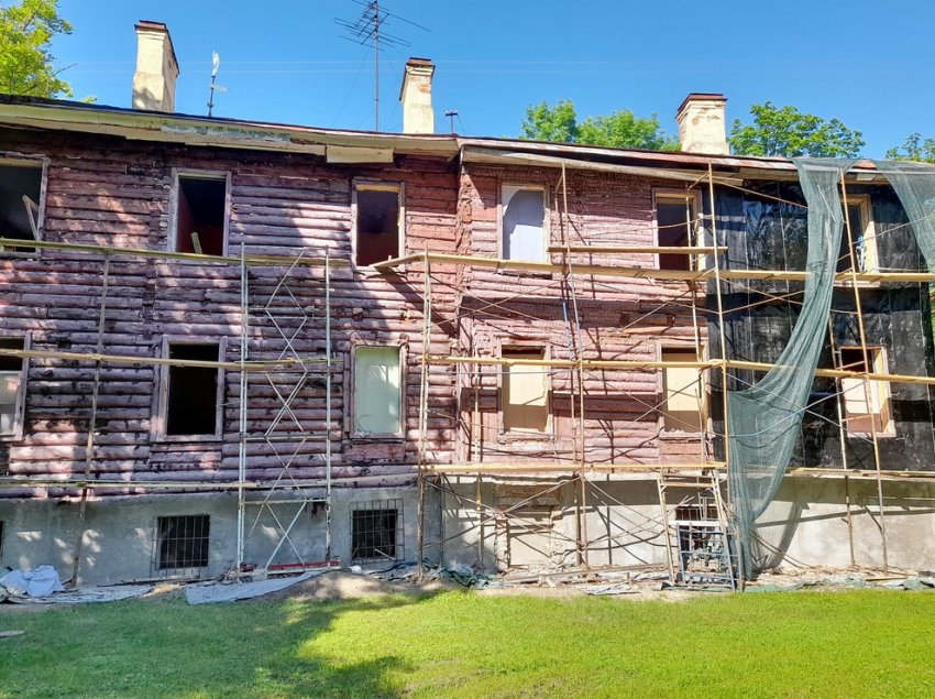 В Пушкине капитально ремонтируют деревянный дом Олениных на углу Пушкинской и Дворцовой улиц. Ранее власти обещали провести работы на фасадах в рамках адресной программы.