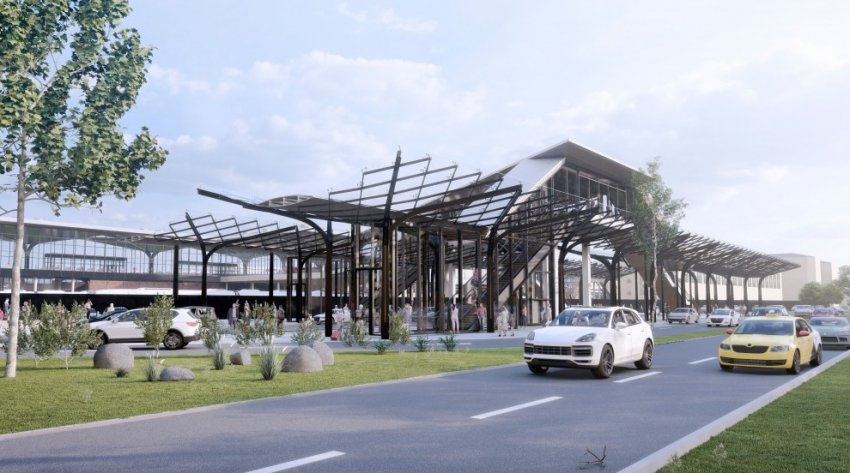 Характерным элементом архитектуры терминала станут навесы и их опоры в форме бумеранга.