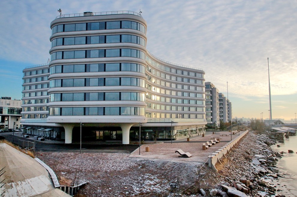 На берегу Лахтинской гавани возле Прозрачного моста завершилось строительство гостиницы. В плане она напоминает трехлопастный пропеллер.