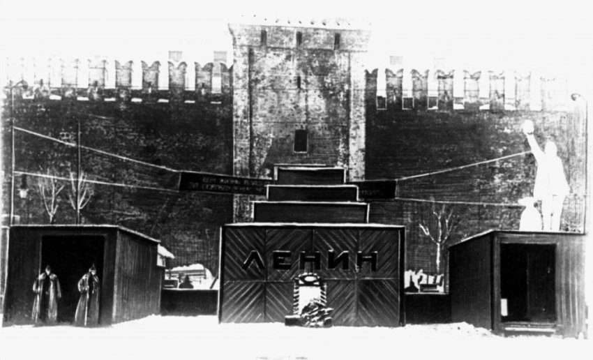 …Самый первый Мавзолей строили из архангельской сосны. Конструкция его была достаточно простой – три куба, соединенных короткими переходами. В самом большом кубе с надписью «Ленин» было помещено тело вождя, два других предназначались для входа и выхода с лестниц, ведущих в траурный зал. Над средним кубом соорудили уменьшающиеся ступени, что сразу облагородило облик здания, придав ему торжественный вид.