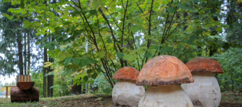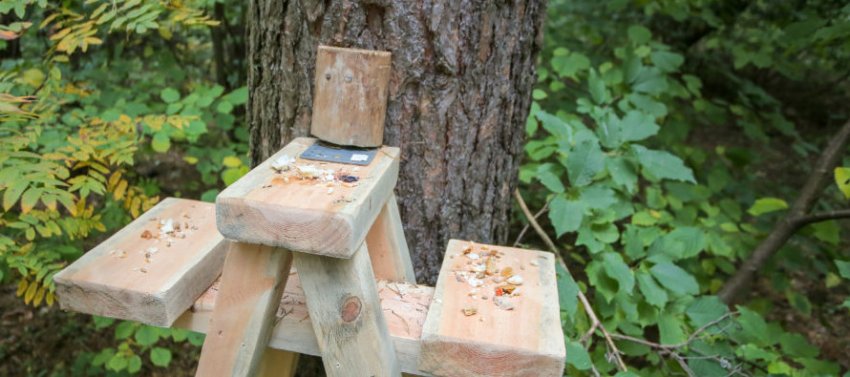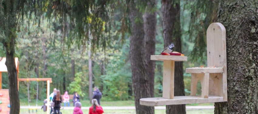 На полянку, где расположился «Дом для всех», ведут две входные группы. Они выполнены из древесины и украшены сверху скворечниками, в которых вполне могут селиться пернатые. Наш собеседник объясняет, что сделали эти конструкции крупнее, чем планировали изначально, для того, чтобы на территорию могла беспрепятственно заехать обслуживающая спецтехника. Сразу за импровизированными входами вдоль пешеходной дорожки то тут, то там на деревьях видим кормушки. Все они разные: одна в форме домика, другая напоминает кресло, третья представляет собой стульчик со столиком… Рядом с ними — информационные таблички, где написано, чем можно и чем нельзя угощать жителей леса. К слову, в самих кормушках настоящий пир: местные разложили внутри кусочки яблок, семена, орехи… Подмечаем, что в отличие от скамеек и прочих малых архитектурных форм, домики и «столовые» не покрыты декоративно-защитным составом.