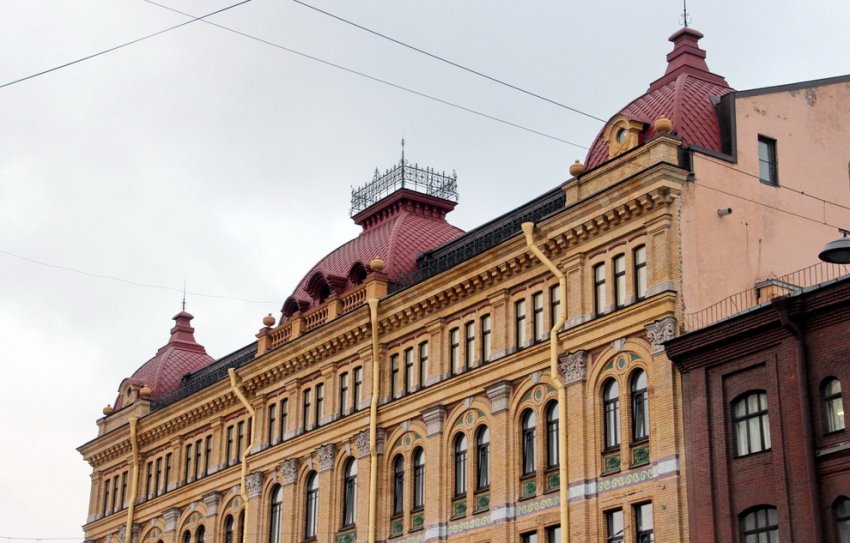 Дом Мельцеров на углу Волынского переулка и Большой Конюшенной улицы был построен в 1905 году по проекту Федора Лидваля. Его завершала башенка с двухъярусным куполом шлемовидной формы. В 1970-х она пропала. Восстановили ее в 2008 году.