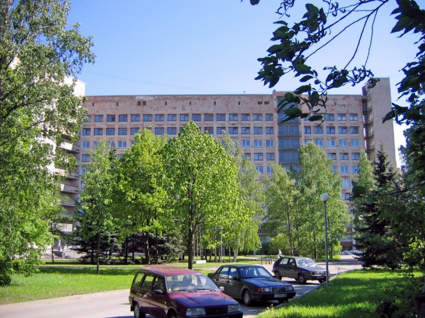 Больница была построена в 1976 году. Ее проект разработали архитекторы Абрам Гольдин и Нина Ефимова. Основной корпус, стоящий торцом к Авангардной улице, имеет 11 этажей, с севера к нему примыкает 2–4-этажное крыло. Тогда фасады были покрыты мелкой светлой плиткой.