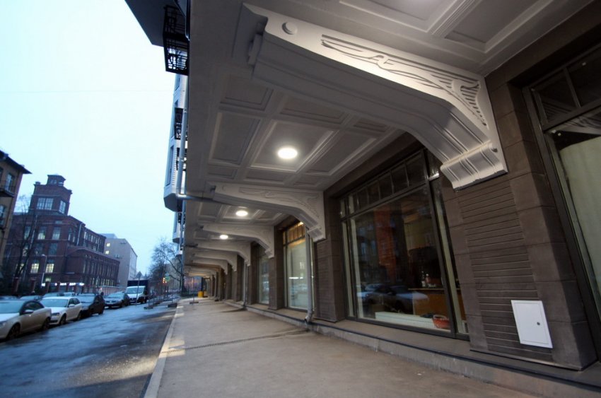 По всей видимости, получившееся тяжеловесное архитектурное решение было выполнено, дабы по максимуму использовать высотные ограничения. Кажется, что от жадности все этажи выше первого залезают за красную линию улицы, полностью нависнув над тротуарами. Однако в реальности все наоборот: пешеходам отдали часть первого этажа — вместо создания там торговых помещений.