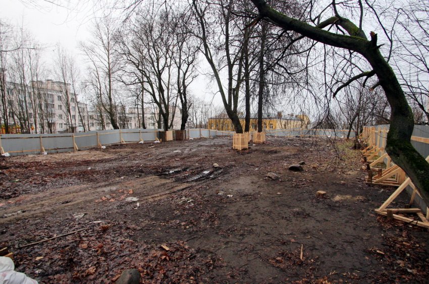 К слову, к участку ранее примыкал другой памятник архитектуры — жилой дом на Еленинской, 8. Он выходил на красную линию. После пожара его снесли, и сейчас там поросль и фрагмент детской площадки. Недавно стало известно, что КГИОП, скорее всего, не будет настаивать на его воссоздании, а сам дом снимут с охраны.