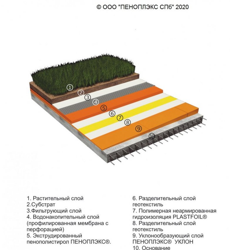 Всё большее распространение в современном строительстве получают эксплуатируемые зеленые кровли на крышах стилобатов и паркингов. Компания «ПЕНОПЛЭКС» предлагает такие решения с использованием своей продукции не только для утепления, но и для создания уклоноообразующего слоя (система ПЕНОПЛЭКС® УКЛОН), а также в качестве гидроизоляции (высококачественная ПВХ мембрана PLASTFOIL®).