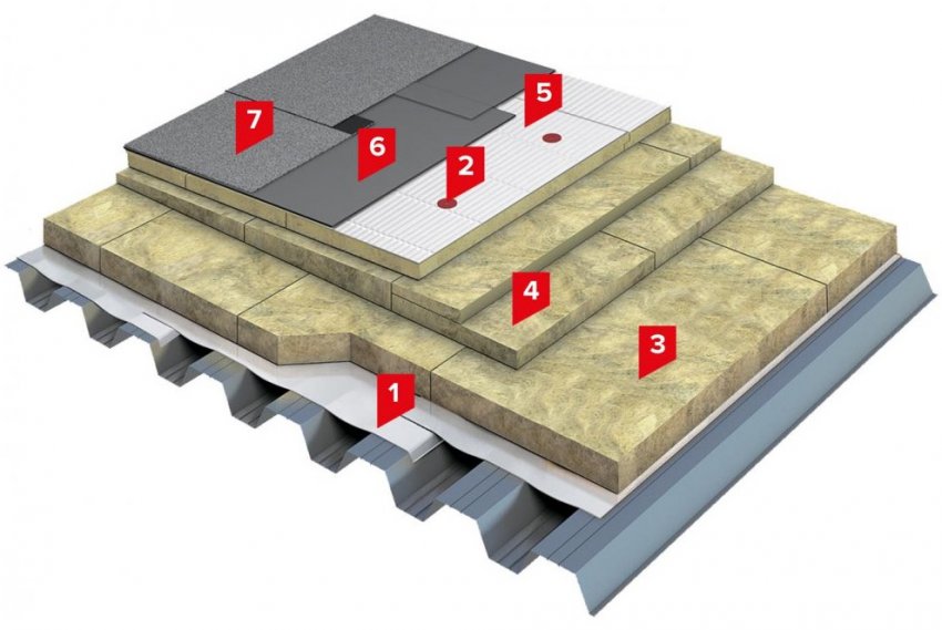 1. ПАРОБАРЬЕР С (А500 или Ф 1000); 2.Телескопический крепеж ТехноНИКОЛЬ; 3. Минераловатный утеплитель ТЕХНОРУФ Н ПРОФ; 4. Минераловатный утеплитель ТЕХНОРУФ Н КЛИН; 5. Минераловатный утеплитель ТЕХНОРУФ В ПРОФ С; 6. УНИФЛЕКС ЭКСПРЕСС; 7. ТЕХНОЭЛАСТ ПЛАМЯ СТОП