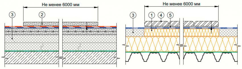 Однако устройство противопожарных поясов – это дополнительные трудозатраты, увеличение стоимости кровельного «пирога» и времени на его монтаж, так как поверх водоизоляционного слоя необходимо предусмотреть защитный слой как у эксплуатируемых кровель шириной не менее шести метров. К тому же противопожарные пояса должны пересекать основание под кровлю (в том числе теплоизоляцию), выполненное из материалов групп горючести Г-3 и Г-4, на всю толщину этих материалов (см. рис.).