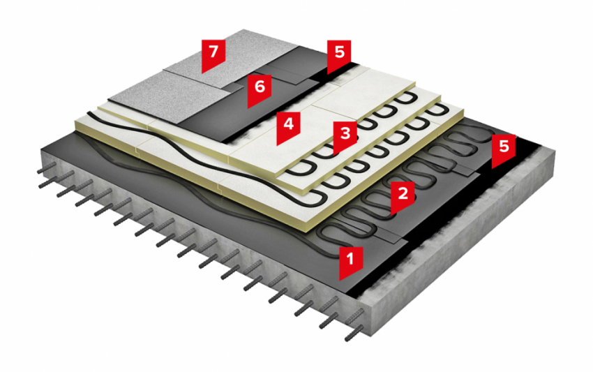 1.БИПОЛЬ; 2. Битум нефтяной кровельный БНК 90/30; 3,4 - Плиты теплоизоляционные PIR; 5. Праймер битумный ТЕХНОНИКОЛЬ № 01; 6. УНИФЛЕКС ЭКСПРЕСС ЭМП (УНИФЛЕКС С); 7. ТЕХНОЭЛАСТ ЭКП