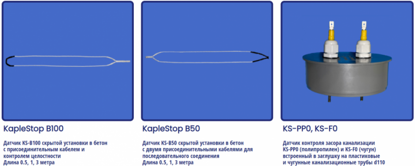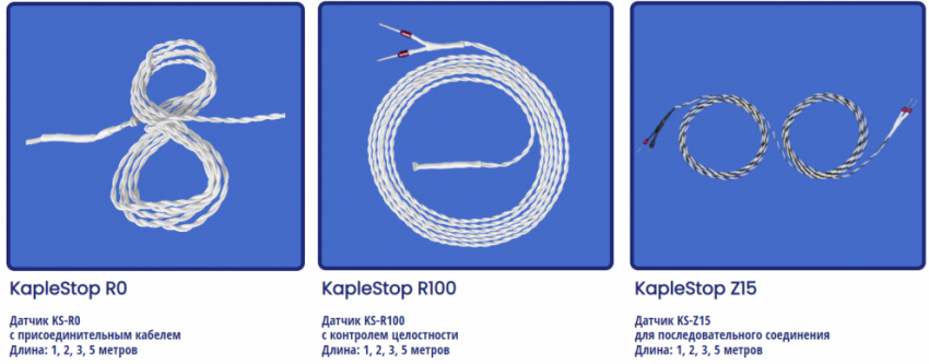У KapleStop четыре вида датчиков. Три из них – линейные, представляющие собой витую пару проводов. Первый вид – конечный датчик. Именно он дал возможность понимать, как происходит намокание и высыхание, с его помощью разработчики стали различать конденсат и протечку.