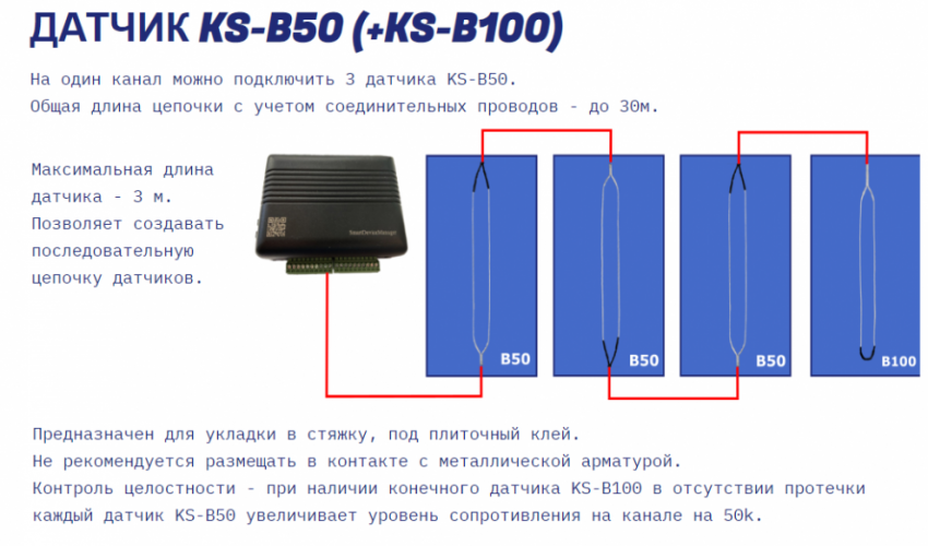 Второй тип – зональный (последовательный) датчик. Такие приборы могут объединяться в последовательную цепь и показывать протечки на больших зонах с точностью до 1 м. Данный вид используются только на горячей и перегретой воде, потому что не может разделить конденсат и протечку.