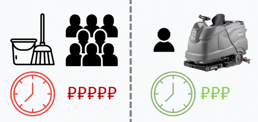 Если у вас большая площадь, которая требует уборки – например, просторное офисное помещение, торговый центр на 10 000 квадратных метров или склад - ваша цель: убрать так, чтобы было чисто. Проведя несложные расчеты, вы понимаете, что убирать данную площадь вручную смогут, положим, 20 человек. На это потребуется 20 зарплат. С поломоечной машиной справился бы один сотрудник за одну зарплату. Но такой машины на данный момент у вас нет. Конечно, можно ее купить. Но для нормальной эксплуатации потребуется регулярное техобслуживание, покупка расходных материалов, чистящих средств и щеток. Также придется учесть расходы на хранение техники и ее амортизацию.