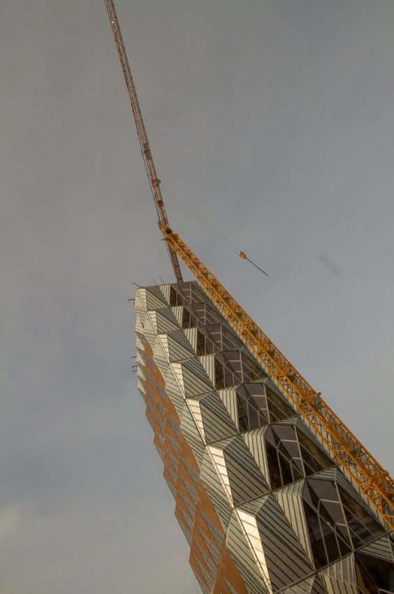Работа по проекту началась в 2012 году. Сегодня на здании находится 154 модуля, причем каждый модуль – это что-то вроде пирамидки, вес которой от 9 до 12 тонн. Изюминка здания – не четыре, а пять фасадов, пятым стала крыша.