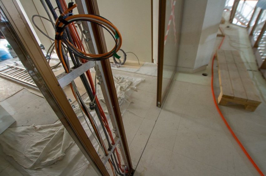 Вода, отопление, электроснабжение, освещение, компьютерные сети — все убрано под фальшпол. И уже на него уложены панели из сульфата кальция (смесь гипса с целлюлозой). Сверху все закрывает мрамор и паркет. Если, не дай Бог, на уровне коммуникаций, где-то что-то перемкнет и начнется пожар, плиты "отреагируют" таким образом, чтобы дым не проникал в помещение.